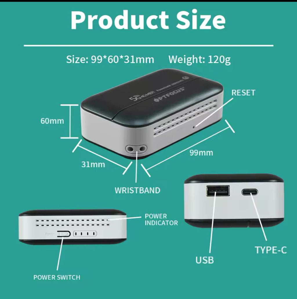 Roteador com bateria de 24 horas, tem saída USB pra carregamento, expande o sinal wifi até 70 metros quadrados e conecta até 10 aparelhos ao mesmo tempo.